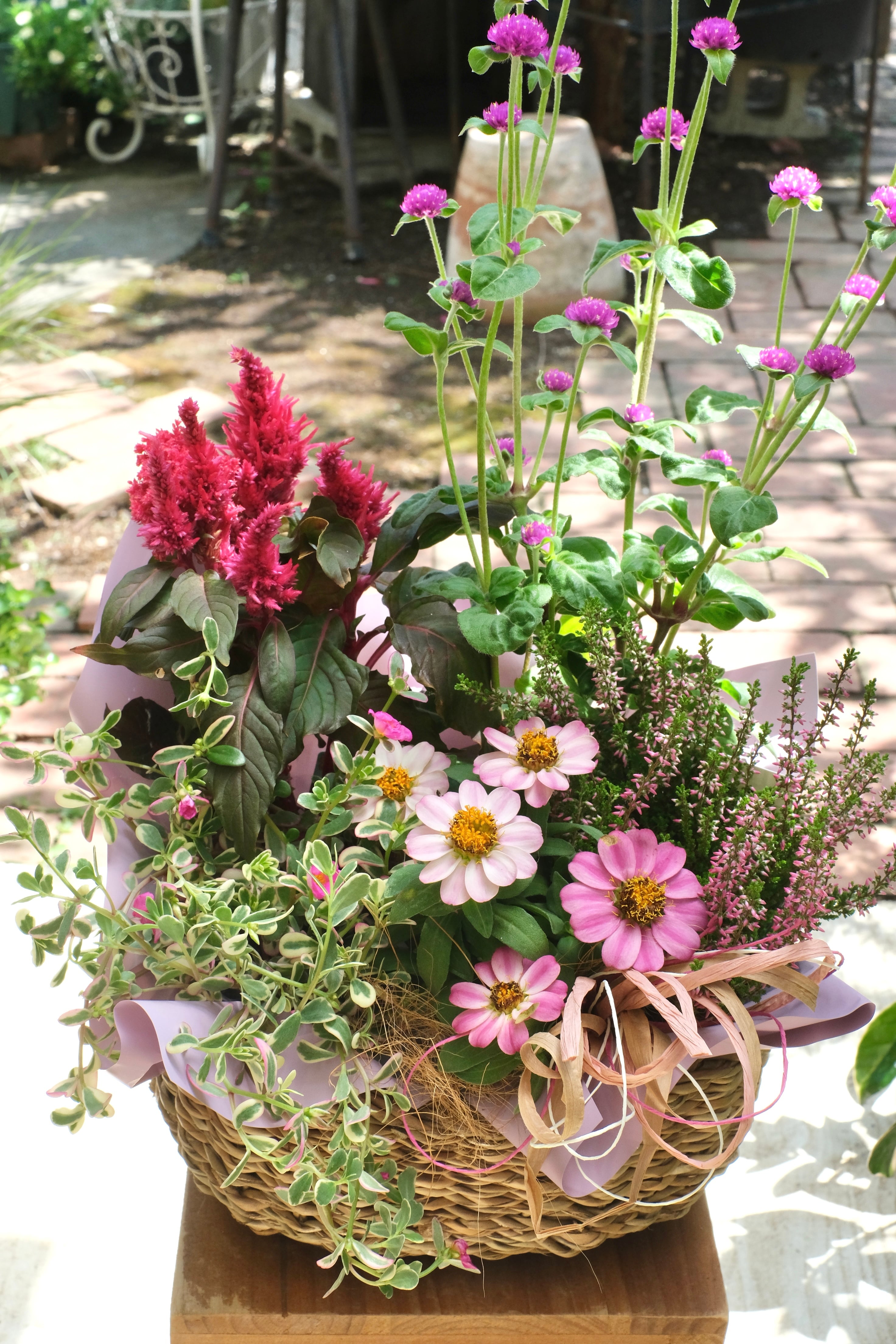 お水をやると、長持ちして花が咲いたり成長したりそして来年も咲く楽しみな花鉢をかわいいバスケットに詰め合わせました